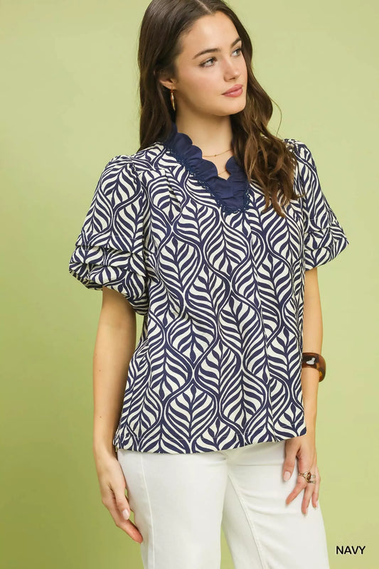 Umgee Printed Puff Sleeve Ruffle Neck Top