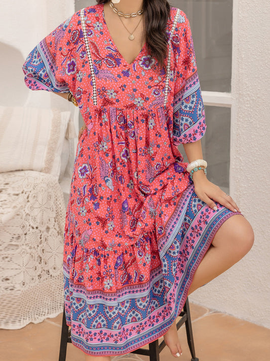 ADORA Printed V-Neck Batwing Sleeve Dress